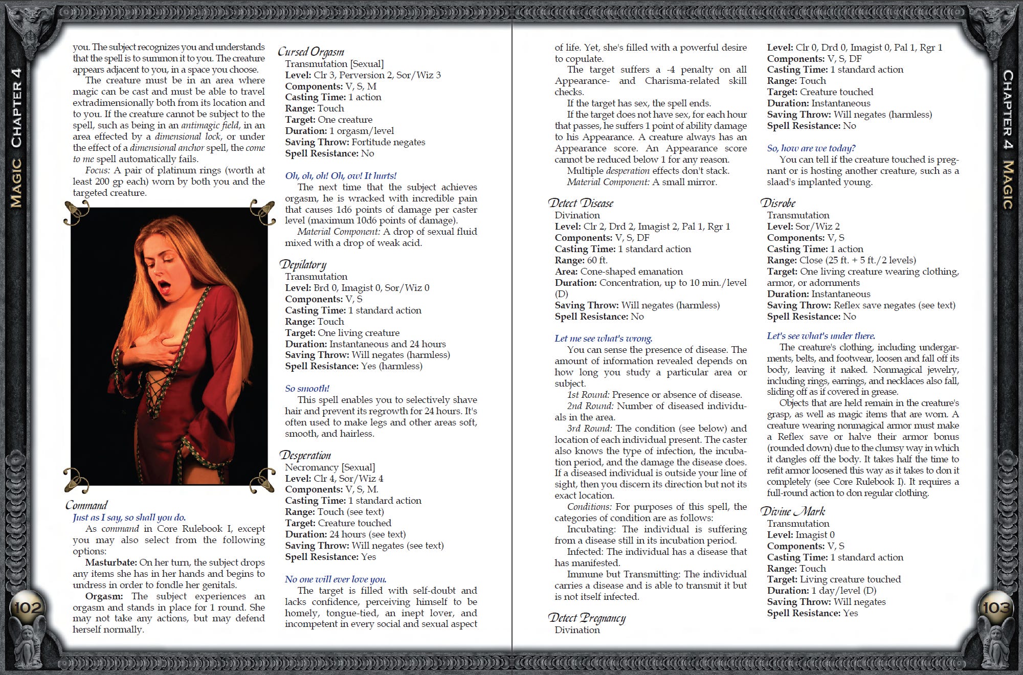 This book mimics the trade dress of the 3.5e D&D books, with body fonts, chapter breaks, and similarly skeuomorphic cover design. In lieu of fantasy illustrations, the Book of Erotic Fantasy uses photographs of nude models. It includes a spell called disrobe that makes someone's clothes fall off if they fail a Dexterity save and expands the command spell to force someone to have an orgasm if they fail a Wisdom save. (Sorry, it’s 3.5e: I mean Reflex and Will saves.)
